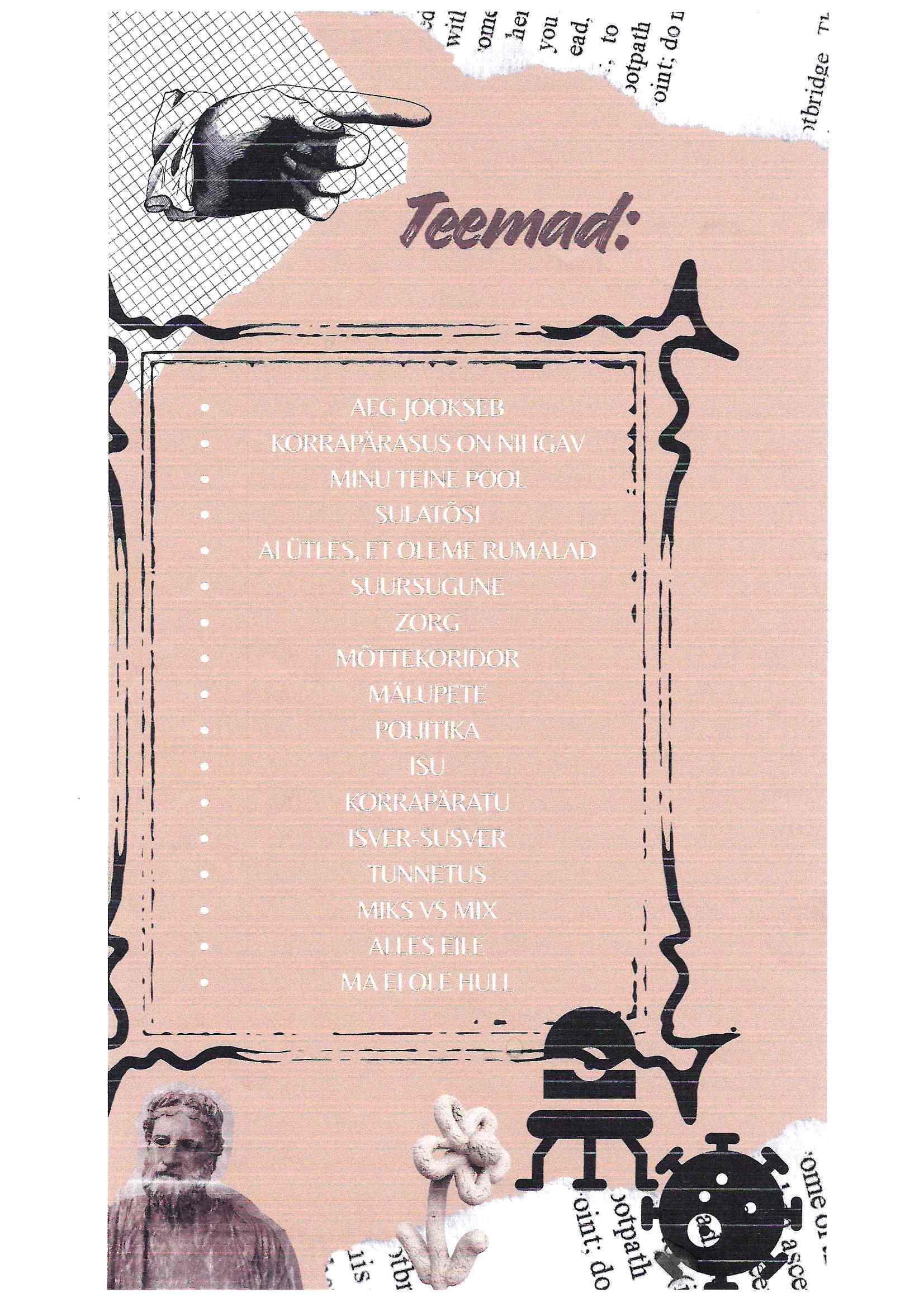 Vali etteantud teemade loetelust endale meelepärane ning ole geniaalne ja leiuta, meisterda, maali või filmi meistriteos-kunstiteose tehnika ja materjal on sinu enda valik!
